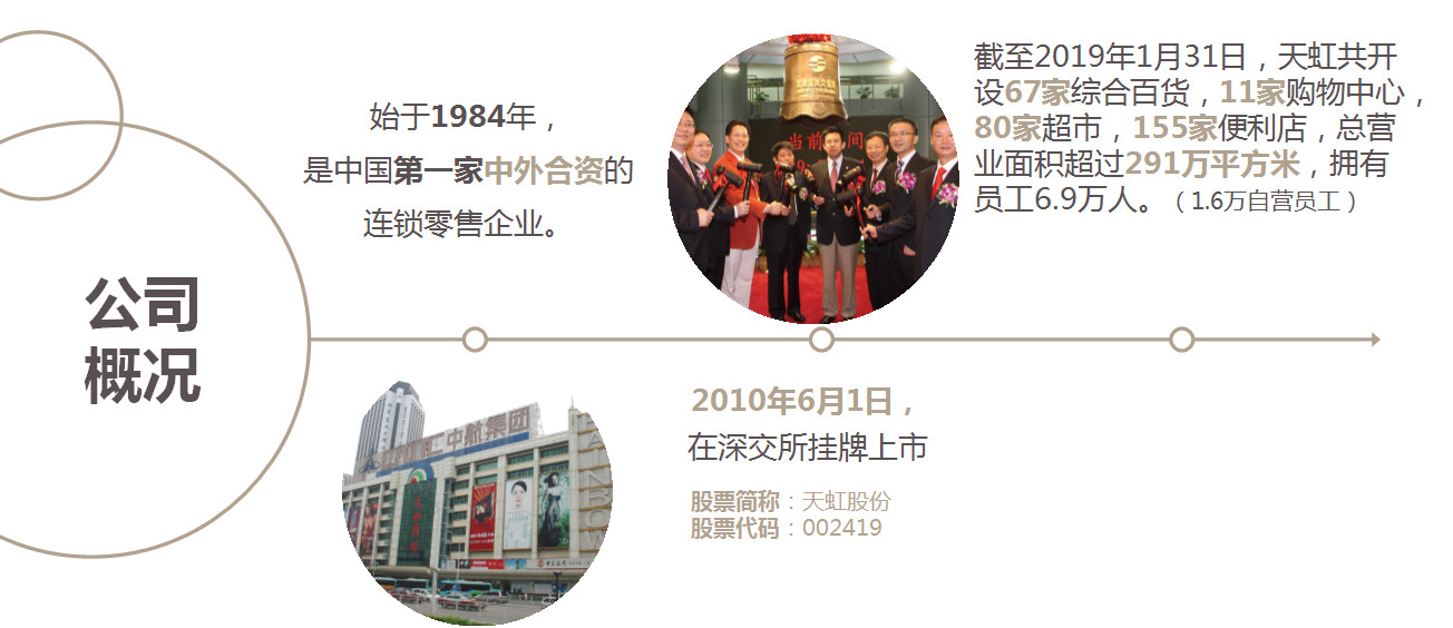 我先來簡單的介紹一下我們天虹基本情況,我們天虹是1984年成立的,現(xiàn)在有30多年的歷史,我們是2015年在新交所上市了,我們的業(yè)態(tài)是有綜合的百貨購物中心、便利店、超市,我們是一個多元化零售的業(yè)態(tài)。