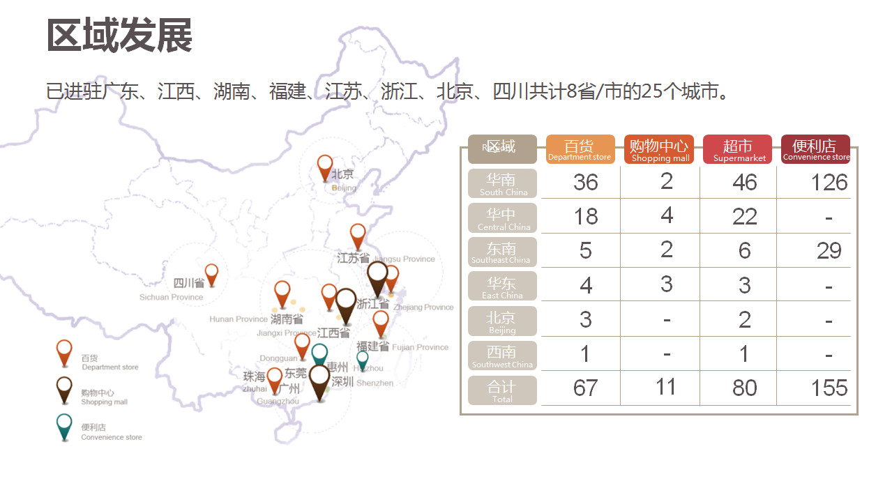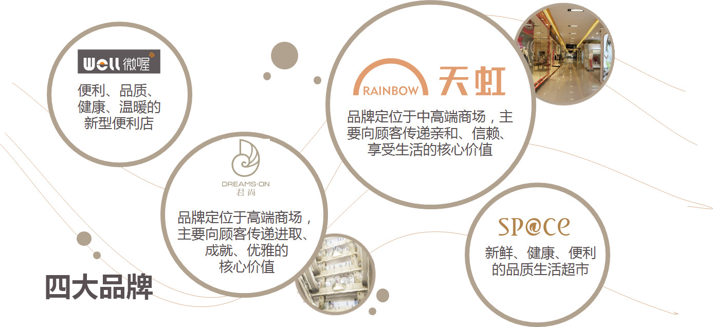 我們品牌有四個品牌,一個是天虹的便利店叫做微喔便利店,一個是天虹本身,面向中高端客戶,服務中產(chǎn)階級的家庭購物,我們有一個高端品牌叫君尚,比我們天虹本身更高的定位,還有一個超市,天虹在發(fā)展獨立超市的業(yè)態(tài)取的名字叫做space,我們天虹有八個省25個城市,天虹購物中心有四種業(yè)態(tài)。
