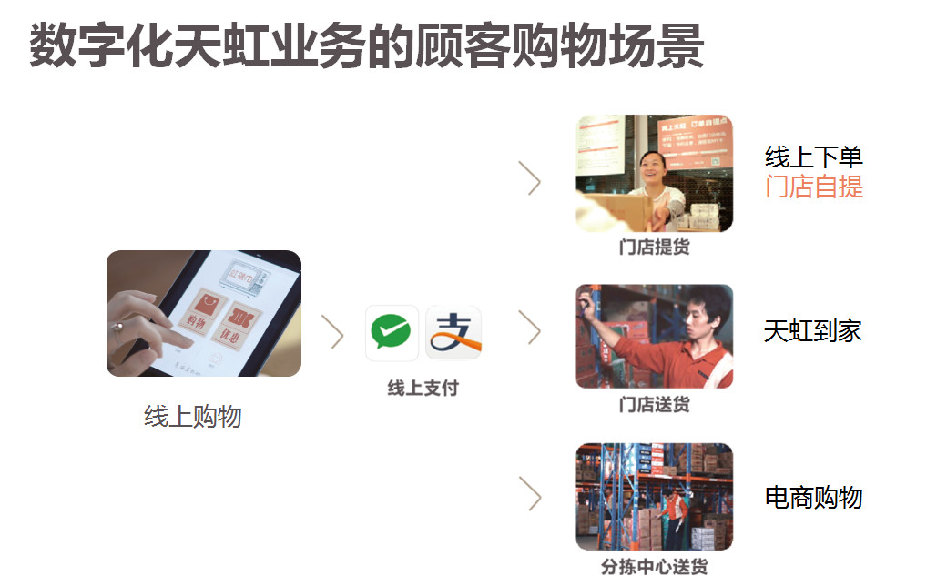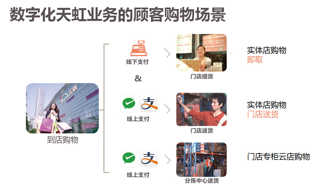 數(shù)字化就是說我們構(gòu)建了新的購物場景,如果顧客到店里消費的話,我們可以由幾種支付方式,現(xiàn)在我們天虹96%到98%已經(jīng)實現(xiàn)了專柜會員端直接收銀,超市也完成了自助收銀和手機收銀,顧客也可以到店馬上拿走,實體店也可以送貨,同時我們百貨商店的云店也可以為顧客提供服務。就是滿足顧客在不同的場景下的利用線上紅領巾的平臺實現(xiàn)顧客各種場景下的服務。