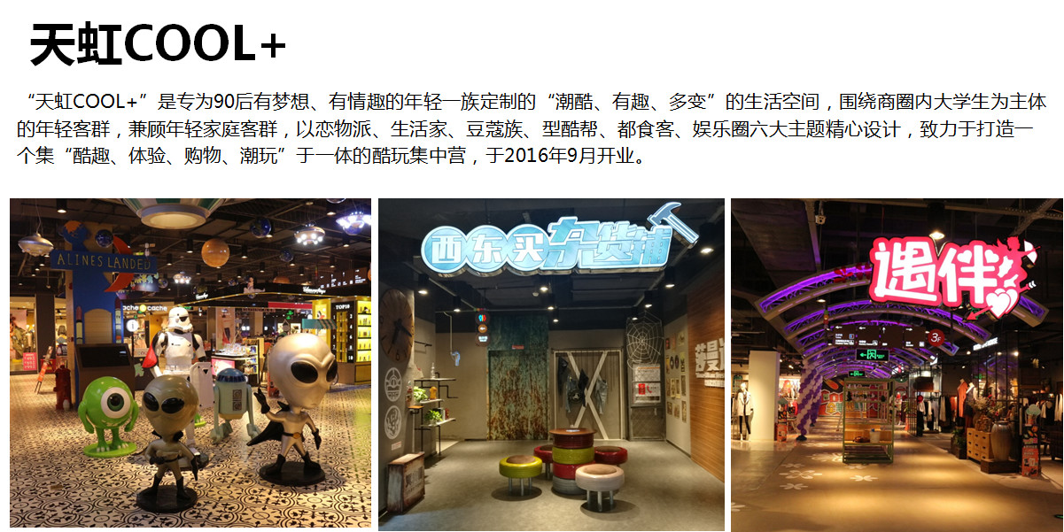 重點講一下這個案例,我們在南昌城市邊緣開了一家COOL+,這家店非常特殊,周圍沒有什么居民社區(qū),有七所大學的市場,當時我們在天虹很少做這樣定位的市場,我們基本上圍繞社區(qū)或者城市中心店,三公里范圍內(nèi)有幾十萬人的中產(chǎn)階級消費的家庭實體,這個店比較特殊,是一個大學生群體,基于這樣市場怎么做好精準定位,這個過程中即使是一個嘗試,也是在這個過程中讓我們看到了精準定位來實現(xiàn)百貨好的業(yè)績非常重要的關(guān)鍵,針對大學生的特點我們是為大學生特殊定制的一個商場,從設計的空間上,到品類的布局上,到提供的商品上,我們圍繞著大學生,包括我們把大學生分成一些生活派、戀物派,我們是基于這樣一些主題打造了不同的街區(qū),吃喝玩樂購的街區(qū),這個商場里面我們的零售比例比原來的百貨減少了,我們這個商場大概零售比例占了50%。更多做了一些體驗消費,我們考慮大學生其實是要喜歡聚、喜歡玩,同時我們在參與COOL+的名字也是大學生一起起的名字,我們選擇一個品類的時候,我們花了很多心思,比方我們選擇一家網(wǎng)吧,是篩選了200家網(wǎng)吧,找了四家有可能跟大學生匹配的網(wǎng)吧,由大學生一起參與,最后我們選定一家網(wǎng)吧,網(wǎng)吧有很多不是所有都是大學生喜歡的網(wǎng)吧,所以我們是這樣去打造這樣一個類別。