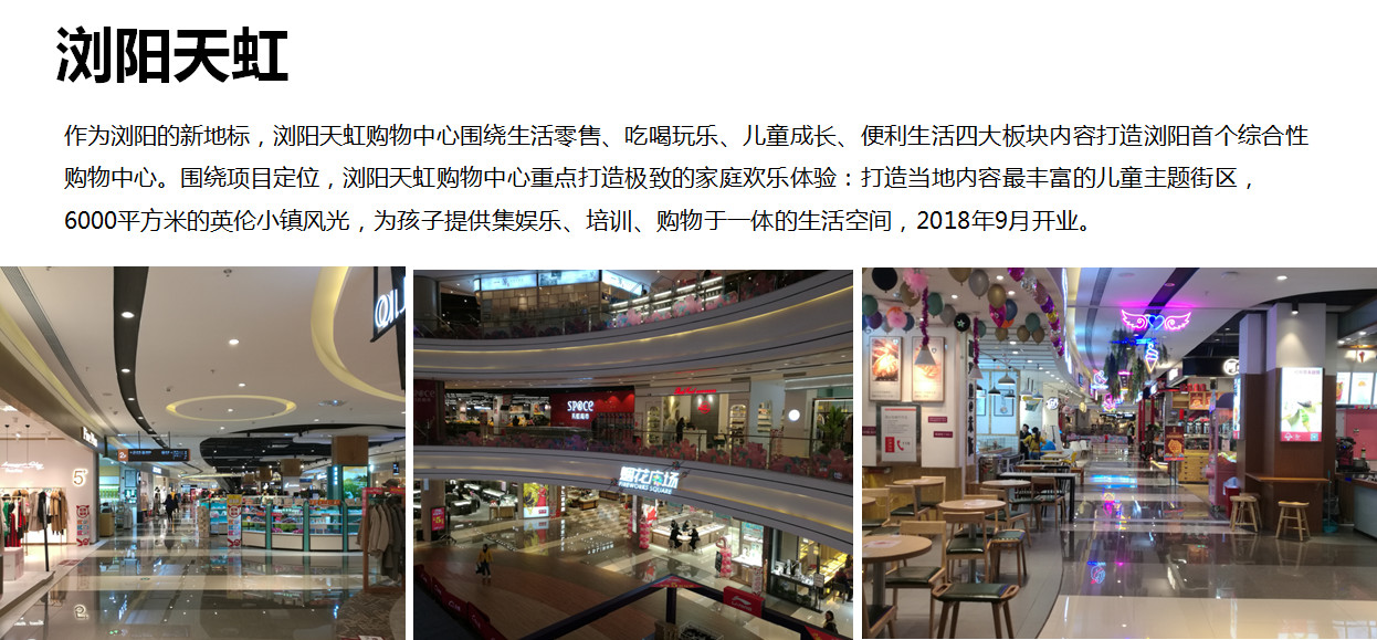 這是我們2018年9月份開的一個在縣級城市的商城——瀏陽商場,一開就非常火爆,成為瀏陽新的一個地標,面積其實不會很大,但是在這樣一些四線城市、三線城市位置上,我們打造吃喝玩樂購,把我們兒童成長,生活零售體驗的模式,打造了一個小型的購物中心。在這樣一個業(yè)態(tài)情況下,我們認為在四線城市還是有非常好的生命力,因為我們的實踐已經(jīng)證明了,包括我們打造了兒童的英倫小鎮(zhèn),我們從孩子的教育、娛樂、購物一體做了一個非常好的組合,也就是說我們現(xiàn)在探索出來在四線城市的小型購物中心滿足城市的購物需求上,我們找到了一些方法。