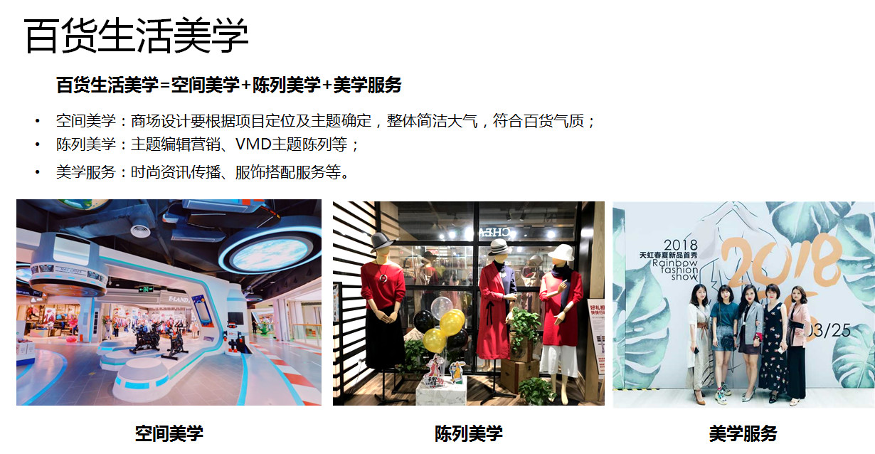 在生活美學,因為天虹百貨是我們主要的業(yè)態(tài),我們在百貨上強調(diào)打造生活美學,包括三個方面,一個是空間美學,一個是陳列美學,一個是美學服務。在這個部分天虹大概已經(jīng)花了兩三年的時間,我們也有我們專門的手冊和為消費者專門打造的一些沙龍服務,這個方面也為顧客不是搭配專業(yè)服務方面收到一個比較好的效果。